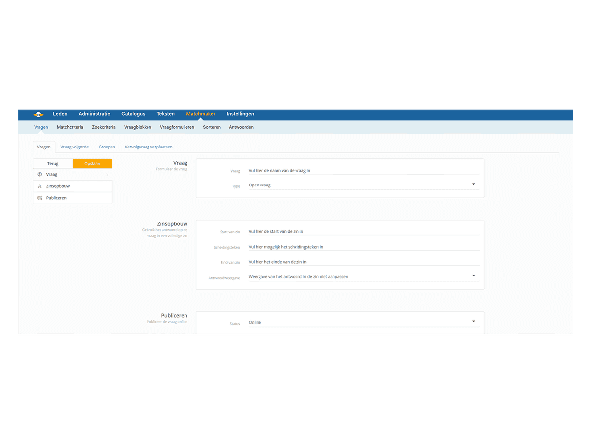 Profilbeschreibung: Oben links auf der Profilseite befindet sich die Profilbeschreibung. Diese Beschreibung ist dynamisch und wird automatisch basierend auf Eigenschaften generiert, bei denen die Satzstruktur ausgefüllt ist. Fügen Sie dazu Fragen zur Über-mich-Gruppe hinzu, auf die übliche Weise (SiteCMS> Matchmaker> Fragen)