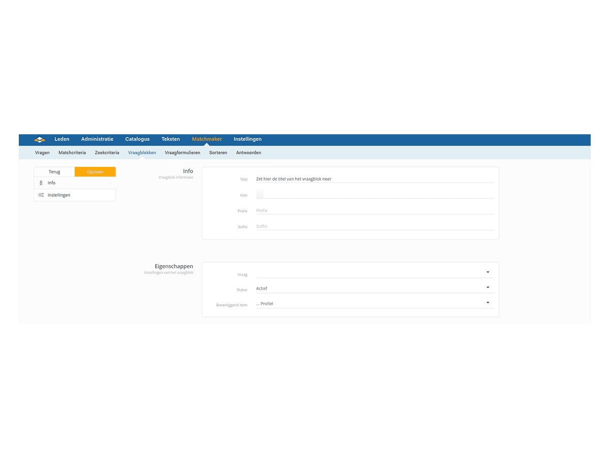 - Gehen Sie zu SiteCMS> Matchmaker> Frageblöcke. Sie sehen nun eine Übersicht über alle Frageblöcke. Für das Profil gibt es zwei Standardfrageblöcke, nämlich: Profil und Thumbnail-Profil. Profil ist der Frageblock, der auf der Profilseite angezeigt wird und aus mehreren Unterüberschriften bestehen kann. Thumbnail-Profil wird auf der Profilübersichtsseite angezeigt.